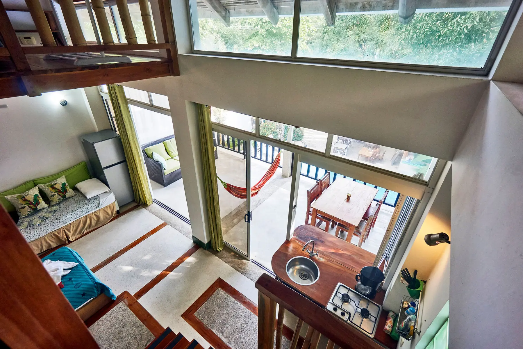 The upper sleeping area feels like a treehouse perched above the tropical garden